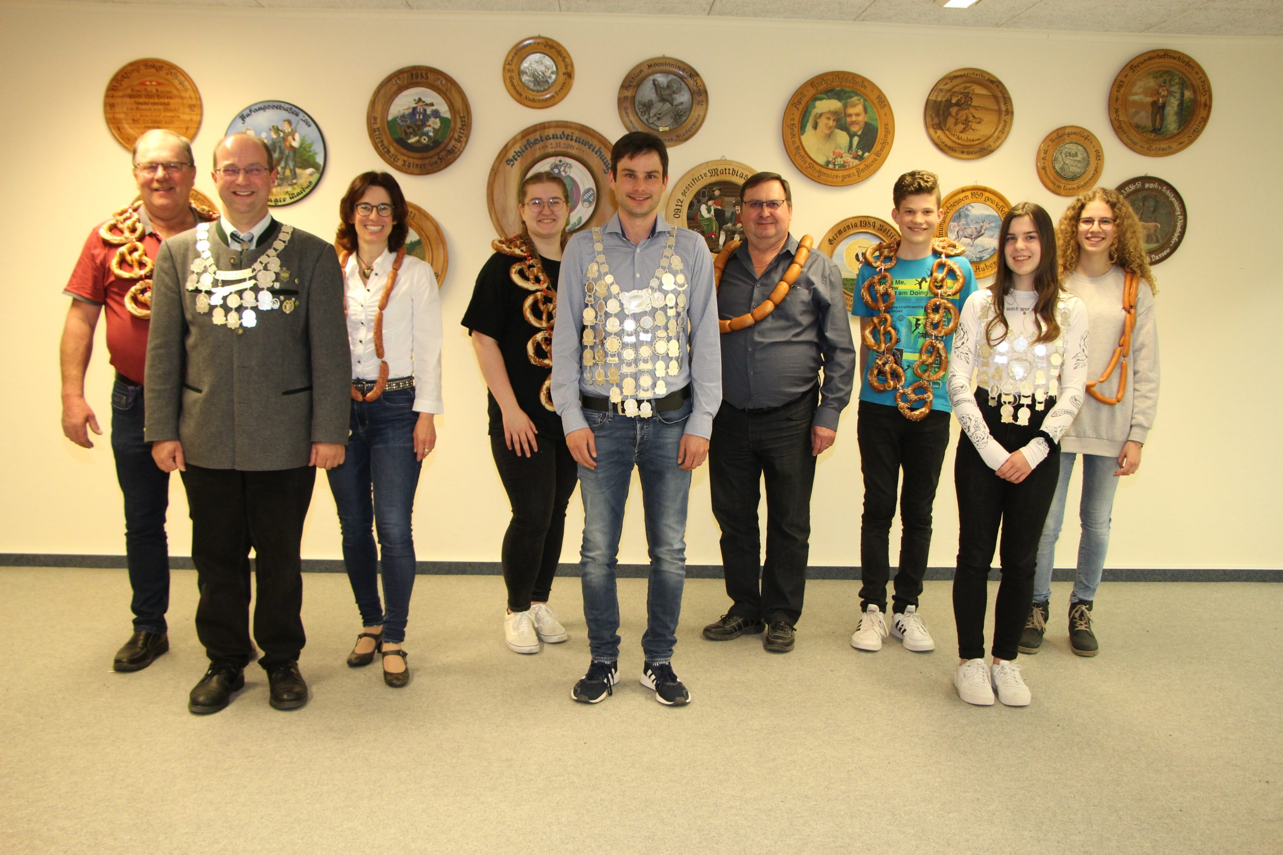 Der wichtigste Teil des Abends war die Königsproklamation. Wer Schützenkönig oder -königin 2022 geworden war, erfuhren sowohl die Beteiligten als auch die Gäste erst bei der Proklamation. Ehe es jedoch soweit war, zeigten sich noch einmal die Schützenkönige bzw. -königinnen 2021 in voller Pracht. Neuer König bei den Schützen wurde Bernhard Müller. Die Königswürde bei der Jugend errang Emily Niedermair, Schützenkönig mit der Pistole wurde Martin Reitinger. Alle drei durften die eindrucksvolle Königskette anlegen, die sie nun für ein Jahr tragen werden. Die zweiten bzw. dritten Sieger bekamen zwar kein Edelmetall um den Hals gelegt, dafür aber Nahrhaftes: Otto Hartkopf (Schützen), Johanna Gröppmair (Jugend) und Sabine Amann (Pistole) wurden Wurstkönig bzw. -königin, Anna Niedermair (Schützen), Dominik Lobermaier (Jugend) und Josef Reitinger jun. (Pistole) bekamen als Brezenkönig/-königin einen Brezenkranz umgehängt. Natürlich durfte nach der Königsproklamation eine alte Tradition nicht fehlen: die „Goaßmaß“, gespendet von den Schützenkönigen. In normalen Zeiten wurde das gehaltvolle Getränk, das aus dunklem Bier, Kirschlikör und Cola besteht, aus einem Krug getrunken, der reihum ging. Dies geht in Corona-Zeiten nicht mehr. Dafür durfte sich dann jeder seine Goaßmaß oder Goaßhalbe selber vom Fass zapfen. Die Wurst- und Brezenkönige spendierten ihre Wurst- bzw. Brezenketten, die im späteren Verlauf des Abends als Brotzeit auf den Tellern der erfreuten Gäste landeten.