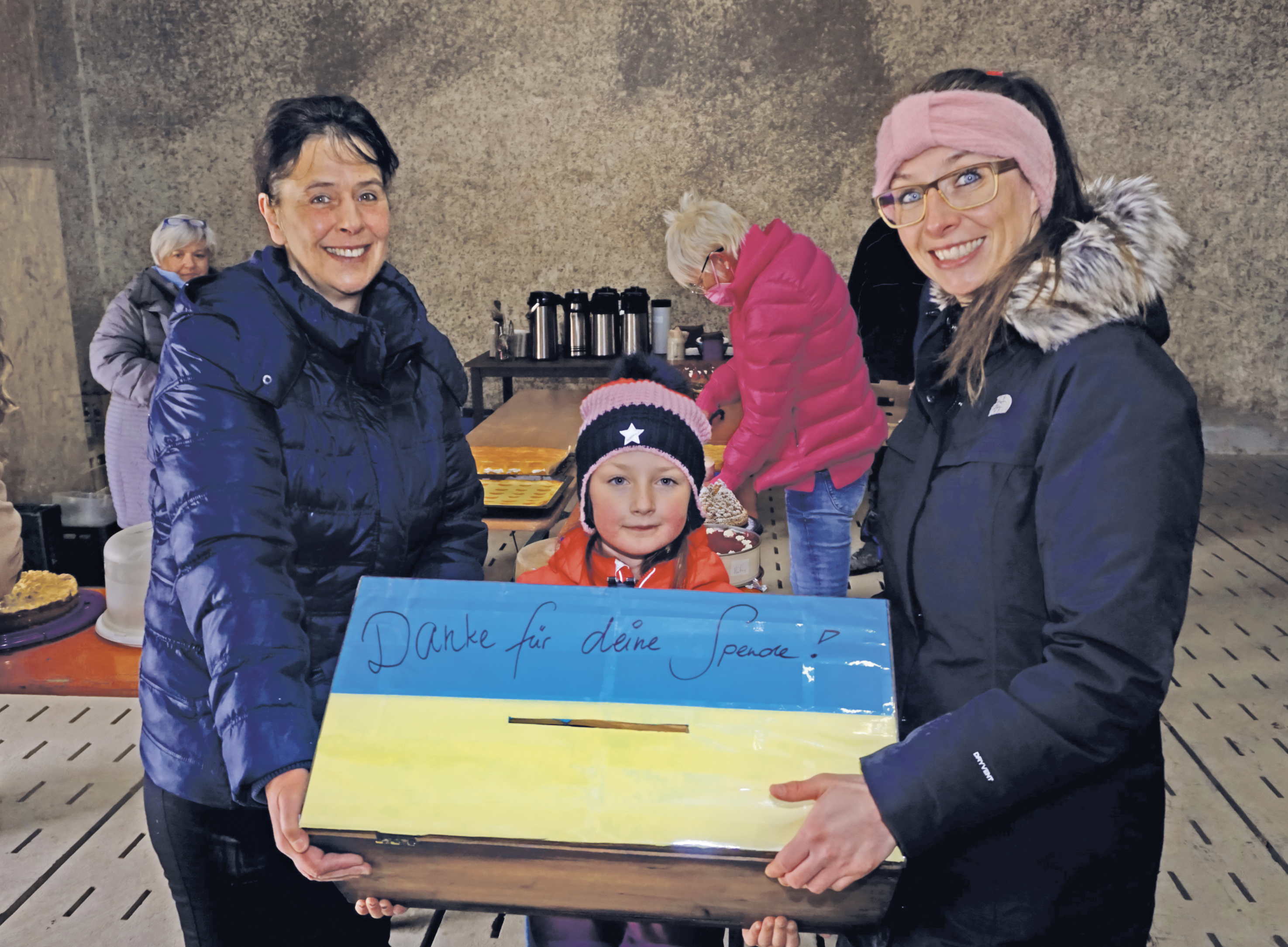 Aber auch durch die ukrainische Pflegekraft ihrer Uroma, die sich große Sorgen darüber machte, wie sie ihre Kinder vor dem Angriffskrieg sicher nach Deutschland bekommt“, erklärt Julia Büttner.„Dazu geht In Lolas Parallelklasse ein Kind, das mit seiner Mama und dem neugeborenen Geschwisterchen geflohen ist. Andere, die wir kennen, haben Flüchtlinge aufgenommen. Das Thema ist greifbar, nicht mehr weit weg, sondern im Gegenteil ganz nah.“ Ihre Tochter beginnt bereits in den ersten Tagen viele Fragen zu stellen, versucht das Unbegreifliche zu verstehen. „Lola hat gewusst, dass Krieg kein gutes Wort ist, aber nicht, was das ist und bedeutet. Wie auch? Ich habe dann versucht kindgerechte Antworten zu geben“, sagt Julia Büttner. Eine Idee zieht viele mit Die zweifache Mutter kennt die ausgeprägte „soziale Ader“ ihrer Großen, die immer sofort zur Stelle ist, wenn es darum geht, anderen unter die Arme zu greifen. So verwundert es Julia Büttner kaum, als Lola ihren Wunsch äußert, helfen zu wollen: „Es war ihr einfach eine Herzensangelegenheit. Es ging darum, etwas zu finden, was sie stemmen kann, um Spenden einzunehmen. Ich glaube, dass es wichtig ist, sich zu überlegen, welche Hilfe man leisten kann.“ Lola hört aufmerksam zu und nickt zustimmend: „Ich habe mit meiner Mama darüber geredet und bin ich auf die Idee gekommen, Kuchen zu backen und den zu verkaufen.“ Im Anschluss reicht ein kurzes Gespräch mit Monika und Georg Stemmer, um die beiden für die Umsetzung ihres Plans zu gewinnen, erzählt Julia Büttner: „Sie waren sofort Feuer und Flamme, haben ein Gebäude auf ihrem Hof für die Aktion zur Verfügung gestellt, mit Bänken und Heizung ausgestattet.“ Auch andere Freiwillige beteiligen sich sofort, und gehen mit viel Enthusiasmus und noch mehr Können ans Backwerk. Die Kasse klingelt Der Erfolg ist überwältigend. Nach nur einer Stunde und 20 Minuten sind alle Kuchen bis auf den letzten Krümel weg: „Die Leute sind quasi wie die Heuschrecken über uns hergefallen“, lacht Mama Julia Büttner laut und meint begeistert: „Alle waren so großzügig, manche haben für drei Stück Kuchen 50 Euro gegeben, einfach toll. Besonders schön war der Besuch der Ukrainerinnen mit ihren Kindern, die hier in der Gemeinde untergekommen sind.“ Die fehlenden Sprachkenntnisse auf beiden Seiten, machen Blicke um Längen wett: „Sie spiegelten so viel Dankbarkeit für diese Hilfe, das sprach einfach Bände“, stellt Julia Büttner fest.“