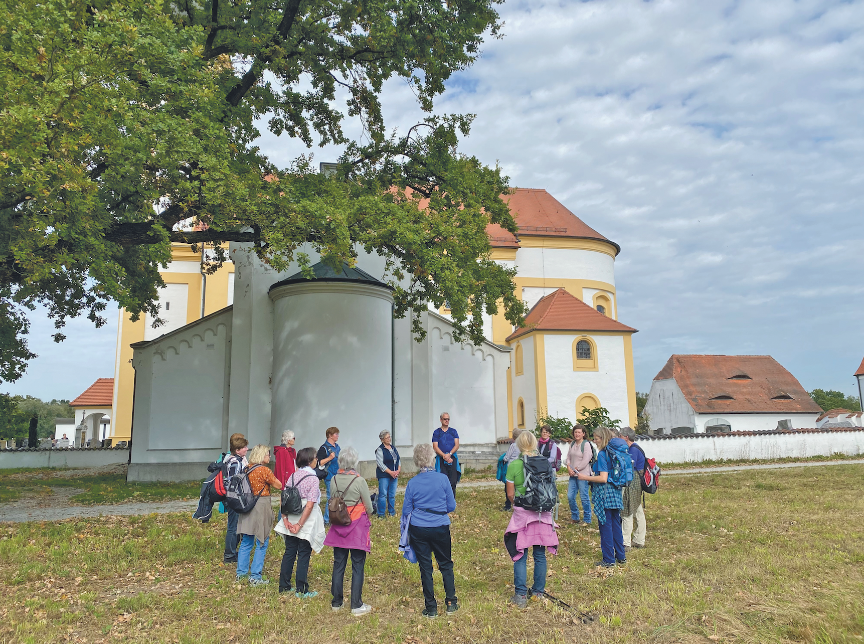 Etwa neun Kilometer lang war der Rundweg, den die beiden Gruppenleiterinnen an diesem Samstag für die Teilnehmer geplant hatten. „Unser Weg ist ein Teil des Landshuter Höhenwanderwegs“, erklärte Claudia Dorfner. Und dieser hat nicht nur optisch, sondern auch historisch einiges zu bieten. Denn immer wieder erzählen keltische Überreste, die unsere Vorfahren für die Nachwelt hinterlassen haben, von der über 7.000-jährigen Besiedlungsgeschichte hier im niederbayrischem Raum. Nach einem anfänglichen kurzen Aufstieg führte die Pilgerroute über saftig grüne Wiesen und Felder durch kurze Waldstücke zum ersten Etappenziel – der Filialkirche Sankt Ulrich in Tiefenbach. Dieses außergewöhnliche Gotteshaus ist nur über eine steile und kurvige Straße oder aber über eine Treppenanlage mit rund 180 Stufen erreichbar. „Sozusagen als Pendant gibt es genau auf der gegenüberliegenden Seite des Isartals eine weitere Kirche, die Georgskirche in Eugenbach“, zeigte Petra Altmann auf. Früher standen anstelle der beiden Kirchen Burganalgen auf den Isarhangleiten. „Sicherlich eine gute Position, um die Handelsreisenden, die sich ihren Weg unten durch das Tal bahnten, gut im Blick zu haben.“