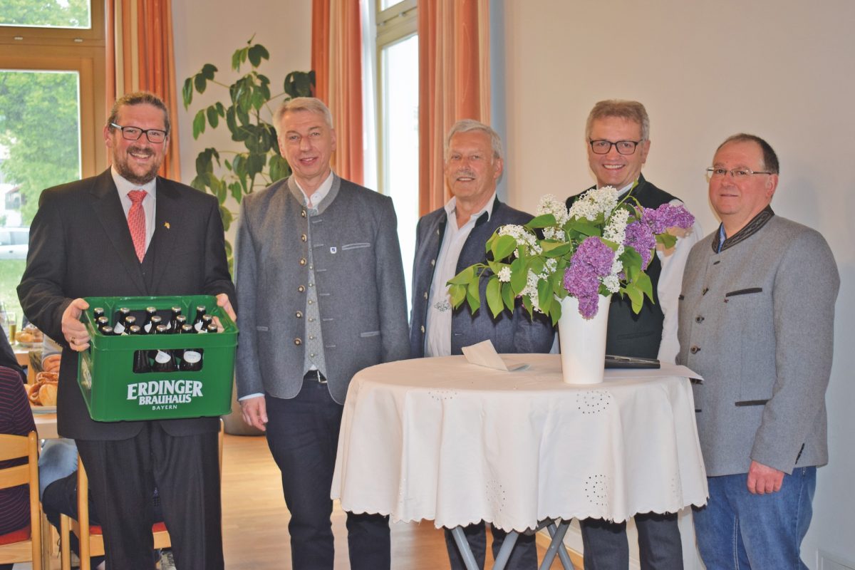 Neben zahlreichen anderen Präsenten bekam Diakon August Bauer bei seiner Verabschiedung auch Bier geschenkt (v.l.n.r.: Diakon August Bauer, Bürgermeister Bernhard Mücke, Eittings Bürgermeister Reinhard Huber, 2. Bürgermeister Anton Nußrainer und Pfarrverbandsrasvorsitzender Klaus Fuchs)