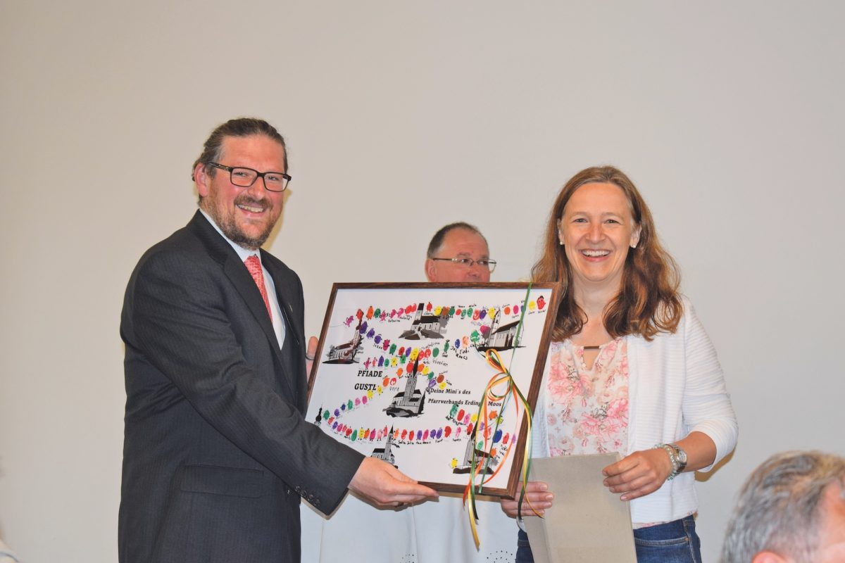 Laut Fuchs hat der „Gustl ois gmacht, er war und ist ein Seelsorger mit Leib und Seele“. Besonders am Herzen hätten ihm dabei auch die Krankenbesuche gelegen, hier hätten sich die vornehmlich älteren Damen schon immer sehr auf den gemeinsamen Ratsch mit dem geselligen Geistlichen gefreut. Zum Abschluss seiner Rede bedankte sich Klaus Fuchs noch einmal ganz herzlich für Bauers großartiges Engagement im Pfarrverband und wünschte ihm und seiner Familie weiterhin Glück, Gesundheit sowie Gottes Segen. Als Abschiedsgeschenk überreichte er ihm ein Bild mit sämtlichen Kirchen des Pfarrverbands Erdinger Moos sowie zwei Flaschen Wein. Nach zwei weiteren kurzen Geschenkübergaben im Namen aller Ministranten sowie sämtlicher Frauengemeinschaften des Pfarrverbands kam mit Bernhard Mücke auch das weltliche Gemeindeoberhaupt noch zu Wort. „Ich bin selbst nicht der fleißigste Kirchgänger“, damit begann der Bürgermeister seine kurze und launige Rede, was ihm Diakon August Bauer aber selbstverständlich nicht im Geringsten übelnahm. Immerhin hatten die beiden ja auch so in den letzten Jahren reichlich Gelegenheit, einander kennenzulernen, denn Bauer ließ es sich nicht nehmen, bei sämtlichen Ortsversammlungen oder anderen Terminen dabei zu sein. Dementsprechend bedankte sich auch Bernhard Mücke für die angenehme und vertrauensvolle Zusammenarbeit, bevor er, ganz der weltliche Vertreter, einen Träger Bier an den jetzt ehemaligen Oberdinger Diakon überreichte.