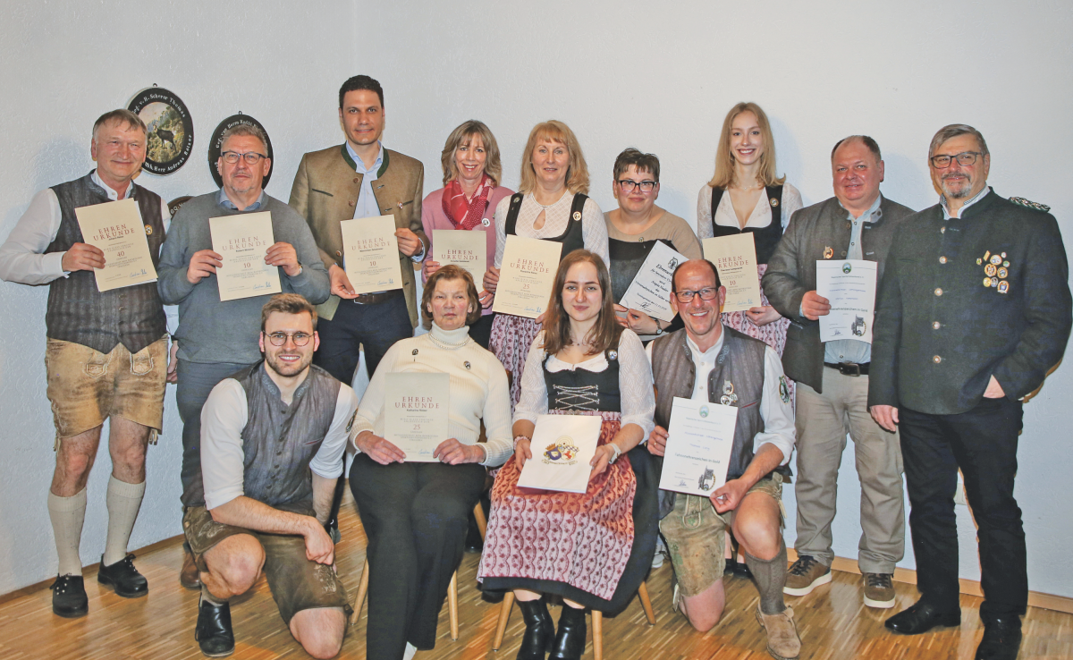 Ein besonderer Höhepunkt war die Ehrung langjähriger Mitglieder. Folgende Personen wurden ausgezeichnet: Eva Wimmer, Robert Wimmer und Max Zehetmeier (10 Jahre), Katharina Rötzer, Theresia Rötzer, Josef Rötzer, Roswitha Reiss, Annette Gaisbauer (25 Jahre), Johann Reiss (40 Jahre), Josef Wörner (60 Jahre). Darüber hinaus wurde Nicole Schmid das Bronzene Ehrenabzeichen und Angela Nadler das silberne Ehrenabzeichen für ihr besonderes Engagement verliehen. Thomas Lang und Stephan Holzmann erhielten das Goldene Ehrenabzeichen für ihre Tätigkeit als Fahnenjunker. Abschließend gab die Vorstandschaft einen Ausblick auf das Vereinsjahr 2026, das wieder zahlreiche Veranstaltungen bereithält.