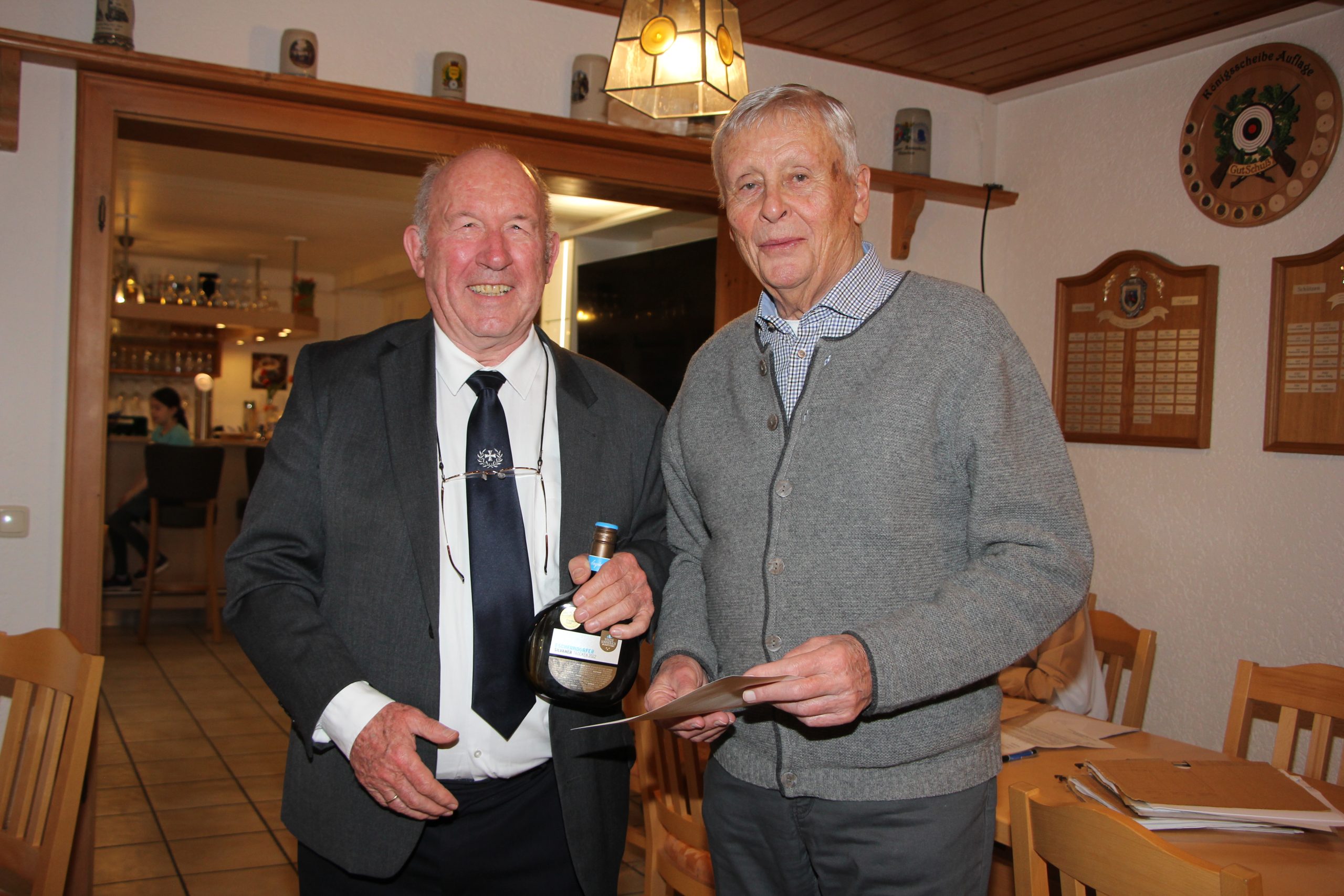 Zum Abschluss hatte Vorstand Bachmair noch zwei Punkte: Er bat, eventuelle Kontoänderungen zeitnah dem Kassier bekanntzugeben. Seine zweite Bitte war, den Verein über das jeweilige Eintrittsjahr zu informieren. „Von einem der Mitglieder weiß ich es zufällig“ meinte er, und das war in diesem Fall auch ein Grund, um dieses Mitglied zu ehren. Alfons Roß trat im Jahr 1960 in den KSV Aufkirchen ein, er hält dem Verein seit 65 Jahren die Treue. Ein guter Anlass, um ihn mit einer Urkunde und einem guten Tropfen zu ehren.