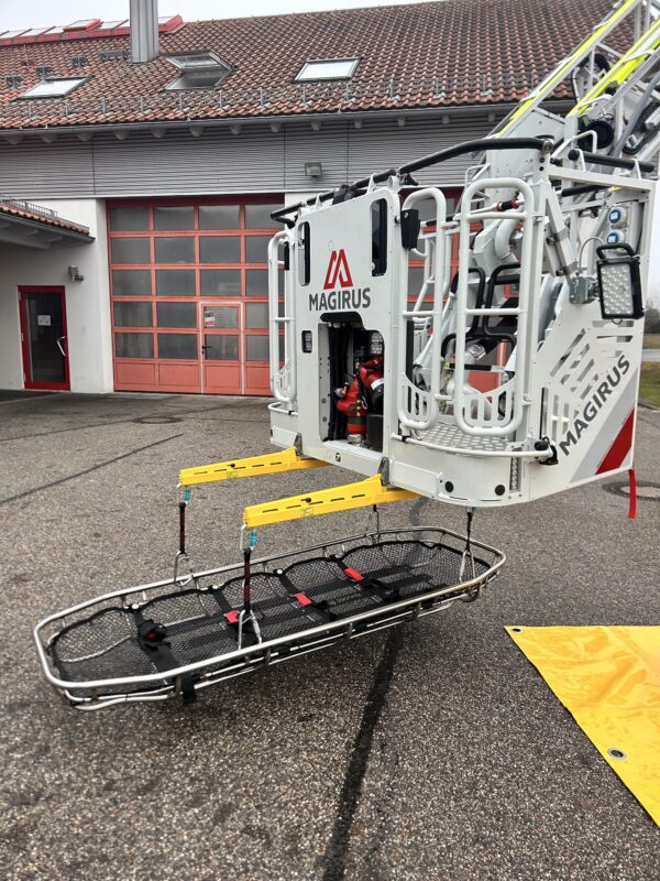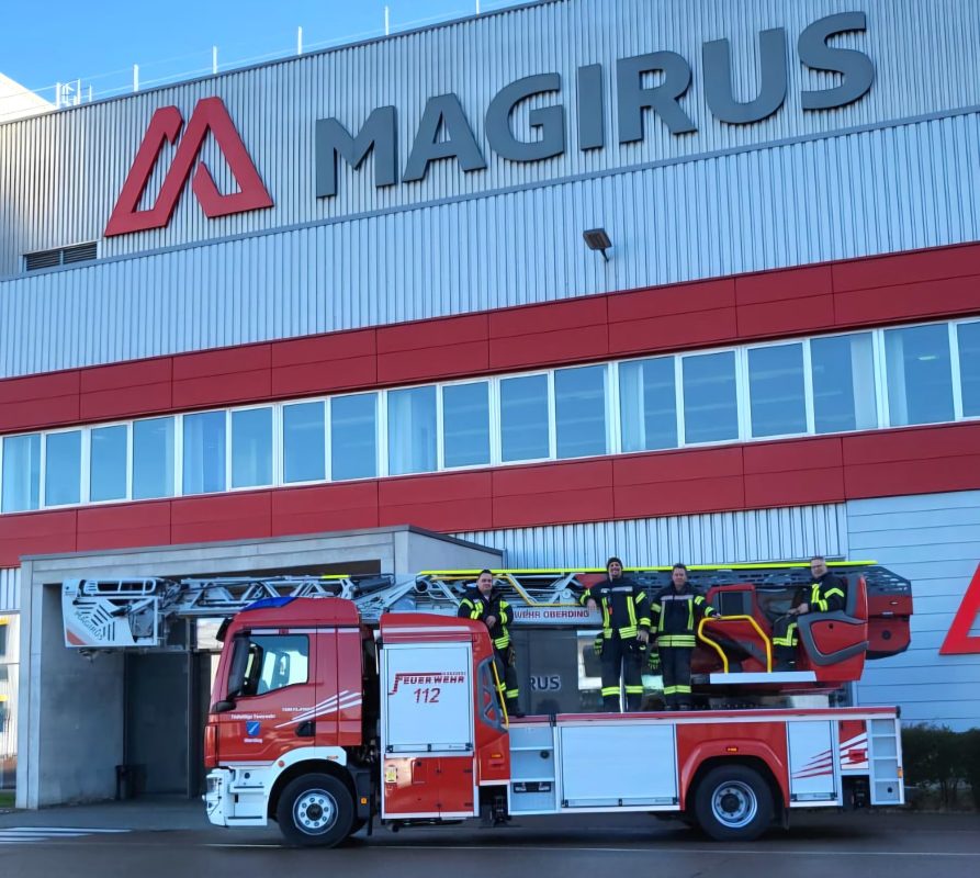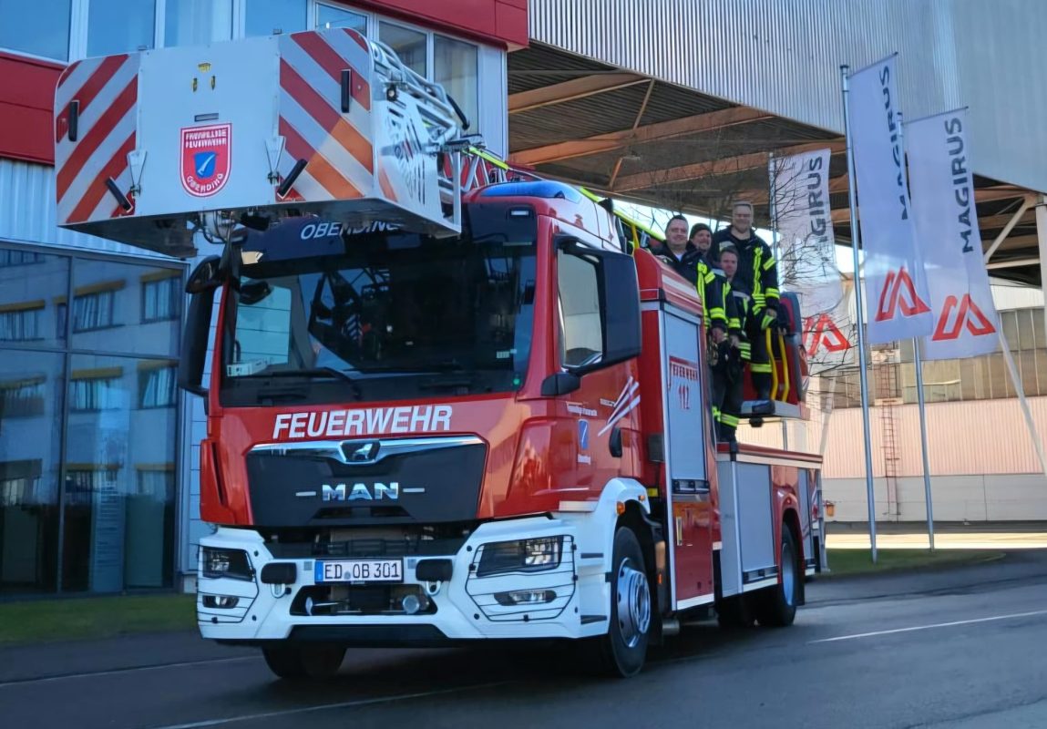 Bei dem neuen Einsatzmittel handelt es sich um eine Drehleiter vom Typ DLK 23/12 mit einer maximalen Ausfahrhöhe von 32 Metern. Das Fahrzeug ist mit einer modernen Smart- Control-Steuerung ausgestattet, die eine präzise und sichere Bedienung ermöglicht. Bereits nach 30 Sekunden ist die Drehleiter einsatzbereit, das vollständige Ausfahren der Leiter dauert rund drei Minuten. Zwar handelt es sich um ein Standardfahrzeug, dennoch wurden gezielt einige Anpassungen vorgenommen. Dazu zählen ein besonders großer Rettungskorb sowie ein integrierter Wasserwerfer am Korb. Geliefert wurde das Fahrzeug inklusive vollständiger Beladung, die bereits rund ein Jahr zuvor beschafft worden war. Die Kosten für die Drehleiter belaufen sich auf rund 930.000 Euro brutto. Die Feuerwehr Oberding hatte den Bedarf frühzeitig erkannt und das Fahrzeug bereits im April 2024 bestellt. Die Lieferzeit betrug knapp zwei Jahre. Mitte Januar 2026 konnte das Fahrzeug schließlich direkt beim Hersteller abgeholt und nach Oberding überführt werden. Heute wäre ein vergleichbares Fahrzeug deutlich teurer.