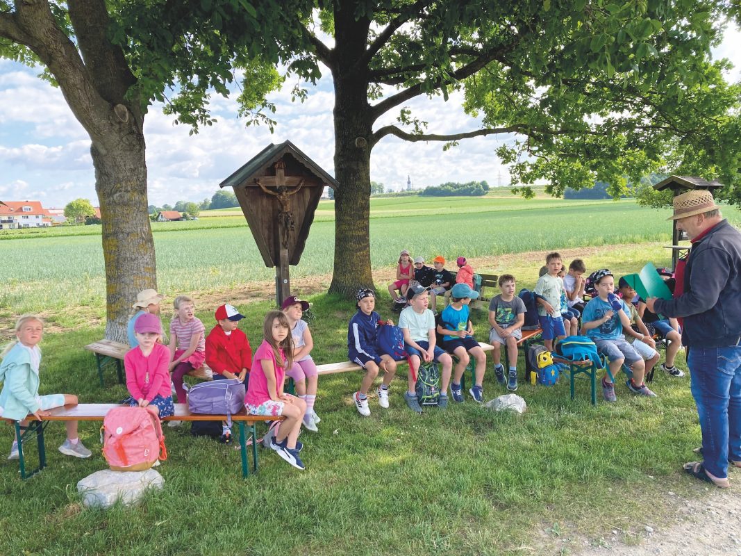 Die beiden ersten Klassen der Grundschule Oberding engagierten sich hier im Sommer unter der Leitung von Herrn Anton Hartshauser als kleine Forscher auf der Suche nach Blumen und Kräutern, wie z.B. das Mädesüß, das bei rheumatischen Erkrankungen verwendet werden kann, die Wiesen-/Ackerwitwenblume, die ihre Heilkräfte bei chronischen Hauterkrankungen, Husten und Halsleiden entfaltet oder der gewöhnliche Blutweiderich, der im 16.Jahrhundert sowohl zum Gerben von Leder als auch zum Imprägnieren von Holz und Seilen hergenommen wurde und den vor allem auch die Wildbienen sehr gerne aufsuchen. Die Kinder erstellten Schaubilder mit den abgepflückten Pflanzen, die sie anschließend stolz mit in die Schule nahmen und ausstellten.