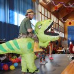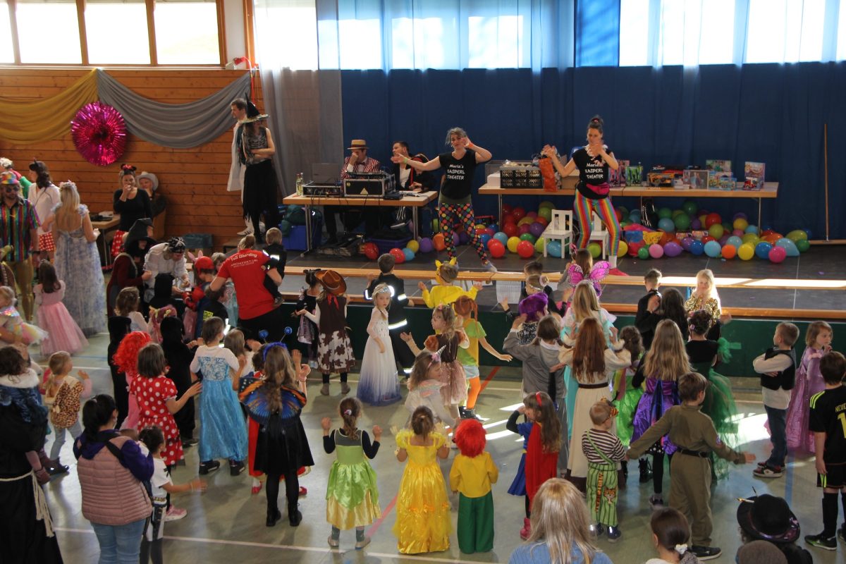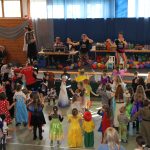 An diesem Sonntagnachmittag wimmelte es dort nur so von verkleideten Gestalten. Tiere aller Art tummelten sich zwischen den Tischen und auf der Tanzfläche, man entdeckte Zauberer, Waldzwerge und Polizisten. Dart Vader und Spiderman probierten kurz mal aus, wer stärker ist, Astronauten und sogar Edward mit den Scherenhänden wurden gesichtet. Zarte Prinzessinnen schwebten durch die Halle, und auch Pippi Langstrumpf und Pumuckl waren in mehrfacher Ausfertigung anwesend. Sogar viele Mamas und Papas, Omas und Opas hatten sich originell verkleidet. Die Stimmung war bestens. Dafür sorgte vor allem das Animationsteam Geli und Maria, die eine lange Liste mit Liedern und Spielen vorbereitet hatten. Auf die Frage „macht ihr zwischendurch mal eine Pause?“ schüttelten die beiden nur verwundert den Kopf, „nein, das geht bei uns durch bis zum Schluss!“