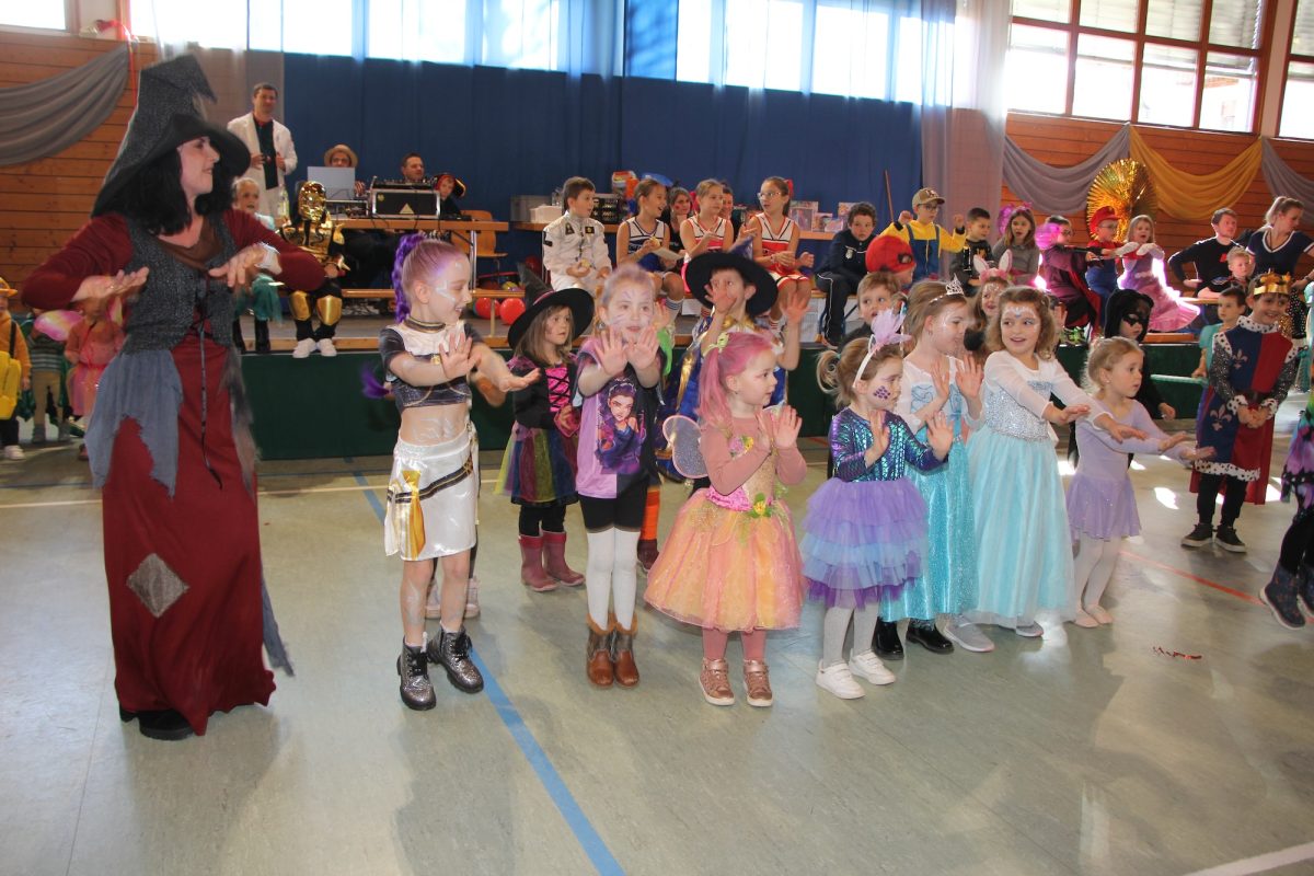 Es wurde getanzt und gesungen, die meisten Kinder konnten die Texte auswendig und wussten auch die dazugehörigen Bewegungen. Notfalls half ein kurzer Blick auf Geli und Maria, die auf der Bühne vortanzten, dann war man gleich wieder auf dem Laufenden. Spiele dürfen beim Kinderfasching natürlich nicht fehlen und so gab es zwischen viel Gaudi, z.B. beim Schokokuss- Wettbewerb, bei dem man ohne Hände in rasender Geschwindigkeit einen Schokokuss verdrücken musste. Für die Sieger gab es am Ende einen Preis (aber hoffentlich keinen verdorbenen Magen). Süßigkeiten waren keine Mangelware, denn immer wieder mal flog eine Ladung Bonbons in hohem Bogen von der Bühne ins Publikum. Vorausschauende hatten sich dafür sogar eine kleine Tasche mitgebracht. Die Kindergartenkinder zeigten in ihrer Tanzvorführung, was man alles macht, wenn man gute Laune hat, und auch die Mädels und Jungs der TuSTanzgruppe erfreuten die Gäste mit einer Tanzeinlage. Für beides gab es viel Beifall.