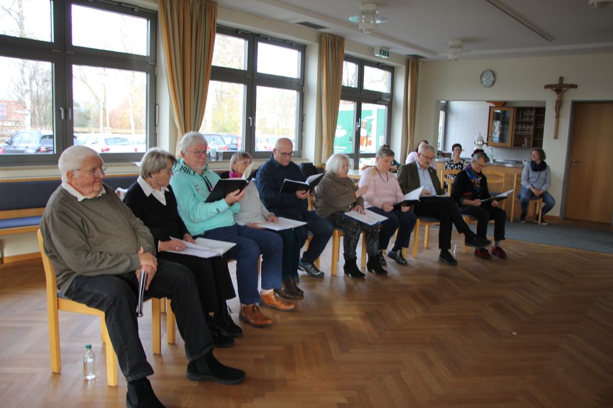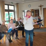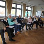 Ein bisschen aufgeregt waren die neun Akteure dann doch, denn der Seniorennachmittag in Notzing war ihr erster Auftritt im „Ausland“, d.h. außerhalb von Erding. Nach einer kurzen Einführung durch Klaus Schiermann, der auch das Ganze moderierte, lasen sie mit verteilten Rollen skurrile, heitere und ernste Wortspiele und Texte von Karl Valentin vor und spielten kleine Szenen und Dialoge. Da erfuhr man u.a. alles Wichtige über den Starnberger See, der erstaunlicherweise nass wird, wenn es regnet, man hörte die Klage einer Wirtshaussemmel und erlebte einen Ehestreit, in dem sich die beiden Partner nur Liebenswürdigkeiten an den Kopf werfen. Eine Auseinandersetzung im Treppenhaus wurde von deftigen Ausdrücken begleitet und das altbekannte Rätsel, ob es nun Semmelnknödeln oder Semmelknödel heißt, blieb nach längerer Diskussion am heimischen Herd auch an diesem Nachmittag ungelöst. Die fünf Frauen und vier Männer lasen und spielten ausdrucksstark, mit viel Körpereinsatz und Engagement, es wurde gesungen und sogar ein Kochlöffel spielte an diesem Nachmittag eine nicht zu übersehende Rolle. Wie von Klaus Schiermann angekündigt, war dies alles im wahrsten Sinne des Wortes ein „erlesenes Vergnügen“! Die Gäste waren begeistert und bedankten sich mit anhaltendem Beifall. Mit bester Laune ging es dann über in den zweiten Teil des Nachmittags mit Kaffee, Kuchen und netten Gesprächen. Die überraschend hohe Anzahl an Besucherinnen und Besucher – es waren mehr als 70 – brachen die Organisatorinnen zum Glück nicht aus der Fassung und dank guter Planung reichte der Kuchen für alle aus.