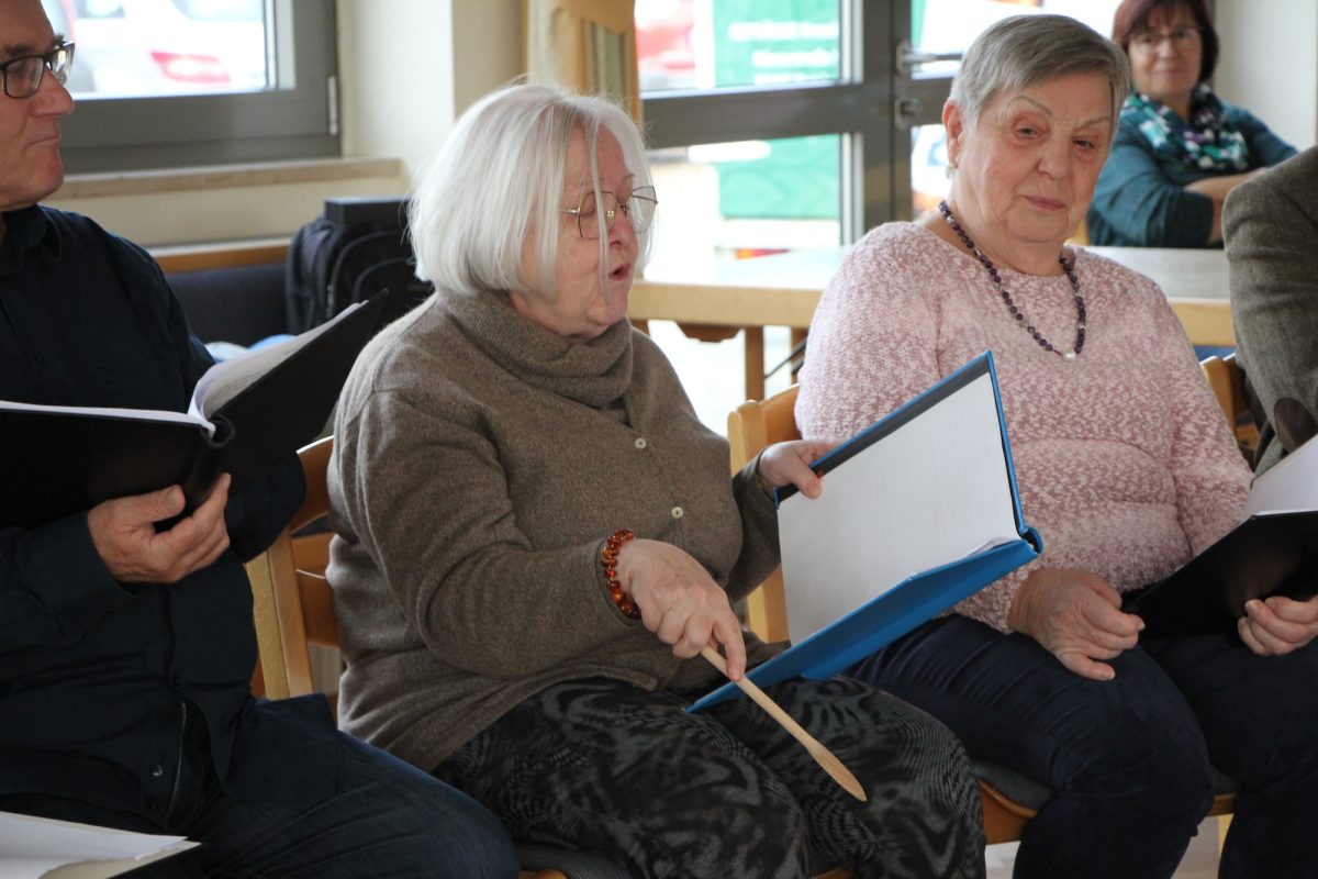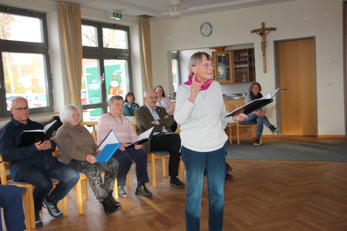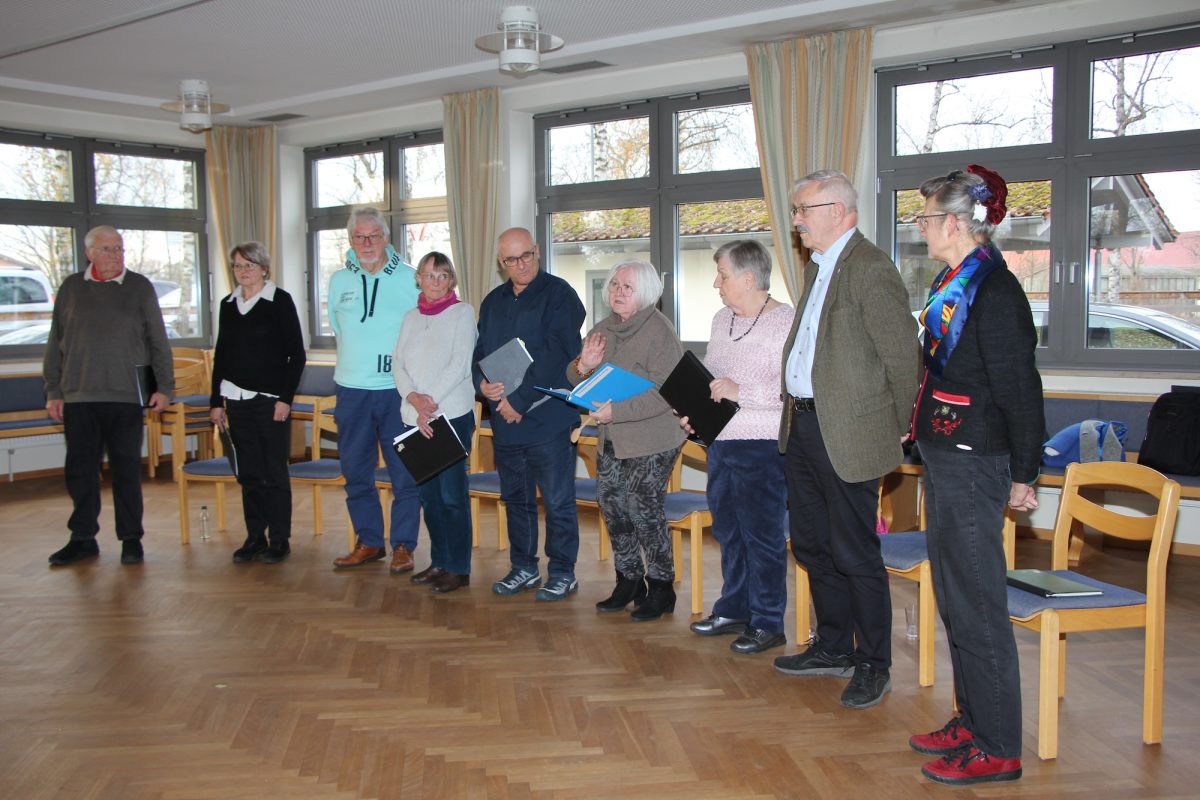 Ein bisschen aufgeregt waren die neun Akteure dann doch, denn der Seniorennachmittag in Notzing war ihr erster Auftritt im „Ausland“, d.h. außerhalb von Erding. Nach einer kurzen Einführung durch Klaus Schiermann, der auch das Ganze moderierte, lasen sie mit verteilten Rollen skurrile, heitere und ernste Wortspiele und Texte von Karl Valentin vor und spielten kleine Szenen und Dialoge. Da erfuhr man u.a. alles Wichtige über den Starnberger See, der erstaunlicherweise nass wird, wenn es regnet, man hörte die Klage einer Wirtshaussemmel und erlebte einen Ehestreit, in dem sich die beiden Partner nur Liebenswürdigkeiten an den Kopf werfen. Eine Auseinandersetzung im Treppenhaus wurde von deftigen Ausdrücken begleitet und das altbekannte Rätsel, ob es nun Semmelnknödeln oder Semmelknödel heißt, blieb nach längerer Diskussion am heimischen Herd auch an diesem Nachmittag ungelöst. Die fünf Frauen und vier Männer lasen und spielten ausdrucksstark, mit viel Körpereinsatz und Engagement, es wurde gesungen und sogar ein Kochlöffel spielte an diesem Nachmittag eine nicht zu übersehende Rolle. Wie von Klaus Schiermann angekündigt, war dies alles im wahrsten Sinne des Wortes ein „erlesenes Vergnügen“! Die Gäste waren begeistert und bedankten sich mit anhaltendem Beifall. Mit bester Laune ging es dann über in den zweiten Teil des Nachmittags mit Kaffee, Kuchen und netten Gesprächen. Die überraschend hohe Anzahl an Besucherinnen und Besucher – es waren mehr als 70 – brachen die Organisatorinnen zum Glück nicht aus der Fassung und dank guter Planung reichte der Kuchen für alle aus.