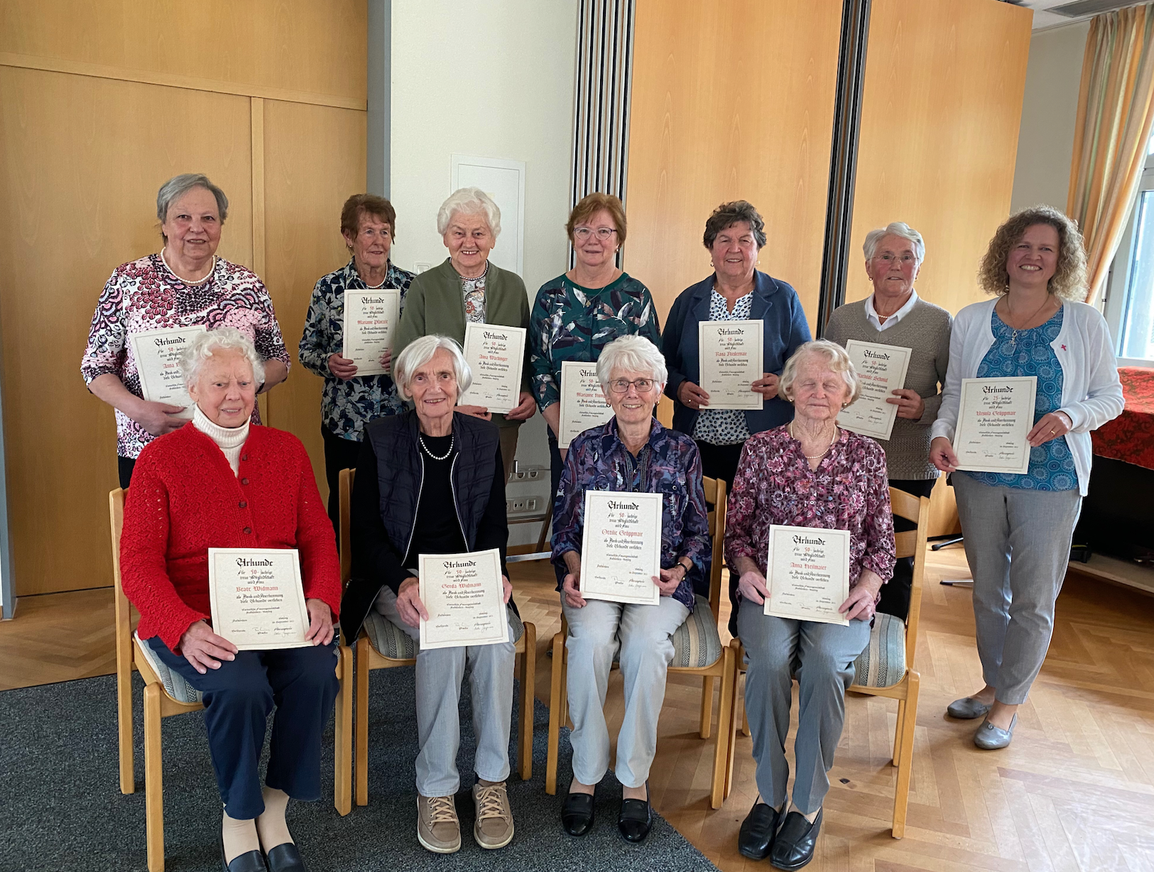 Der Jahresrückblick, den Uschi Gröppmair verlas, zeugte vom bunten und abwechslungsreichen Programm des Notzinger Frauenvereins. So reichte das Angebot von einem Theaterbesuch in Wartenberg über eine Stadtführung in Erding mit Türmerin Doris Bauer bis hin zu einer meditativen Wanderung auf den Marienweg in Maria Thalheim mit Pilgerbegleiterin Petra Altmann und Gemeinderefertin Claudia Dorfner. Auf der Liste fanden sich natürlich auch die jährlich wiederkehrenden Traditionen wie beispielsweise das Kräuterbuschen-Binden, aber auch kirchliche „Highlights“ wie die Mai- und Adventsandachten. Und auch der Kassenbericht von Margot Appel-Walbrun zauberte ein Lächeln ins Gesicht. „Angesichts der Tatsache, dass wir in der Corona-Zeit fast keine Einnahmen hatten und 3.000 Euro an das Sophienhospiz gespendet haben, haben wir unterm Strich hervorragend gewirtschaftet“, freute sich Appel-Walbrun, die sich auch weiterhin um die Finanzen des Frauenvereins kümmern wird. Nach den zahlreichen Ehrungen der treuen Vereinsmitglieder gab es noch eine wichtige Neuigkeit, die den anwesenden Damen präsentiert wurde. Gemeindereferentin Rosemarie Huber wird künftig geistlicher Beistand des Frauenvereins. „Eigentlich bin ich schon im Ruhestand. Oder sollte ich besser sagen, im Unruhestand?“, scherzte die Seelsorgerin nach dem einstimmigen Wahlergebnis. Da Priester künftig mit stetig wachsenden Wirkungskreisen – und damit verbunden Mehraufgaben – konfrontiert werden, hielt der Führungskreis diesen Schritt als zukunftsweisend, so Gröppmair. „Zusammen mit Wortgottesdienstleiterin Cilly Hofmüller sehen wir uns künftig auf der geistlichen, christlichen und kirchlichen Schiene gut versorgt!“