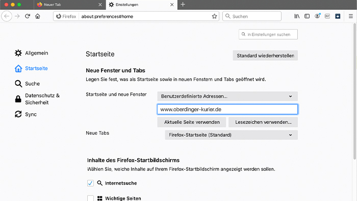 Geben Sie in der vorgesehenen Zeile www.oberdinger-kurier.de ein und schließen Sie das Fenster. Ab sofort sehen Sie die gewünschte Seite bei erneutem Start Ihres Browsers.